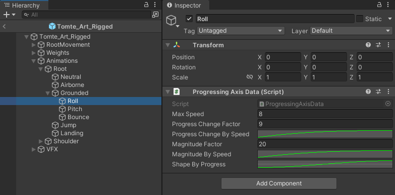 The animation is supplemented by Unity’s Runtime Rigging package that allows for extendable animation re-targeting during runtime. Here a modified version of the Damped Transform component is used to dampen the movement of the character’s joint, giving it a soft, squishy feel. The Damped Transform component is modified to allow for an additional offset to be applied to it. This is used to apply wind effects, as well as pushing the body joints closer together when the character jumps and lands.